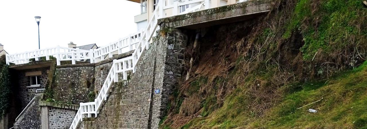 Entre le 6 et le 8 février dernier, un glissement de terrain a affecté un pan de la falaise située en contrebas du rond-point Delpierre, obligeant à interrompre par mesure de précaution le cheminement piéton au droit du désordre. Ce phénomène s’est traduit par un glissement de matériaux en tête, entraînant un sous cavage au niveau de la structure béton servant de trottoir.