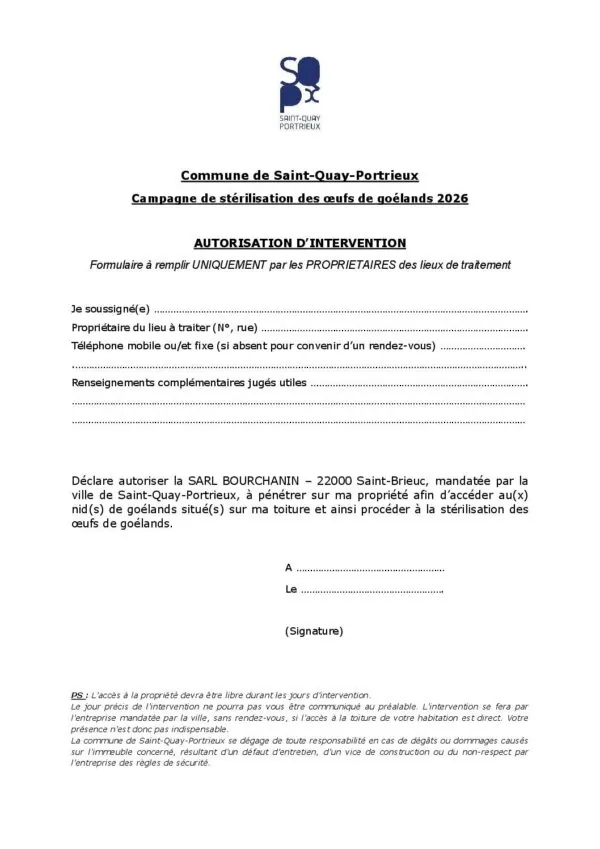 Toute demande devra être accompagnée du formulaire d’autorisation d’intervention dument remplis (A télécharger ci-dessous, à retirer à l’accueil de la Mairie à demander via service.technique@saintquayportrieux.fr.)